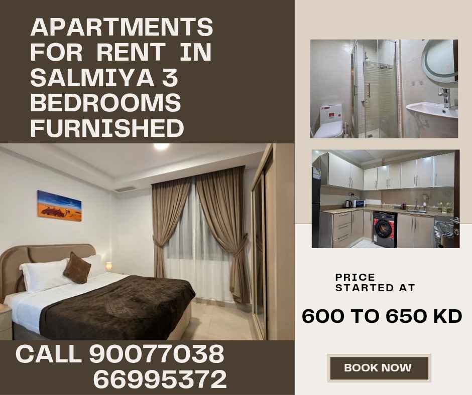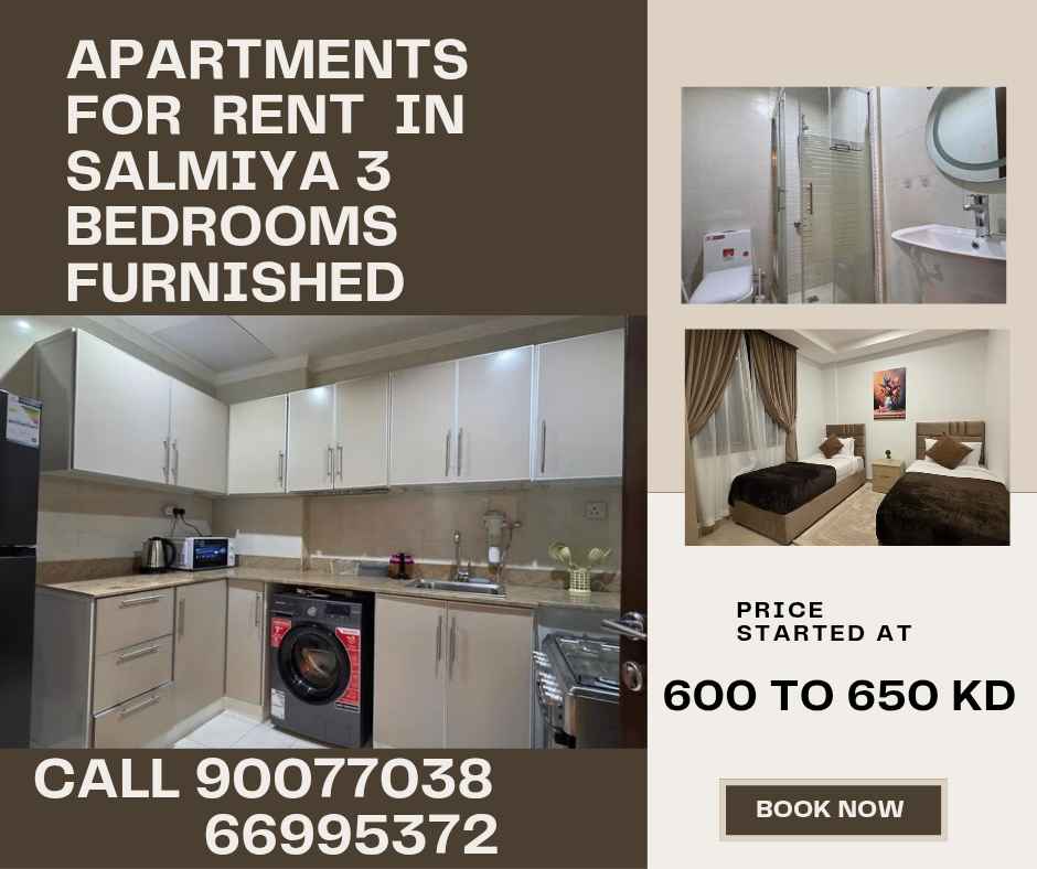 For rent in salmiya ,brand new 3 bedrooms fully furnished ,big living room ,one master bedrooms ,2 normal bedrooms ,bathroom ,kitchen fully equipmemt rent 600 to 650 kd + realestate fees half month call 90077038