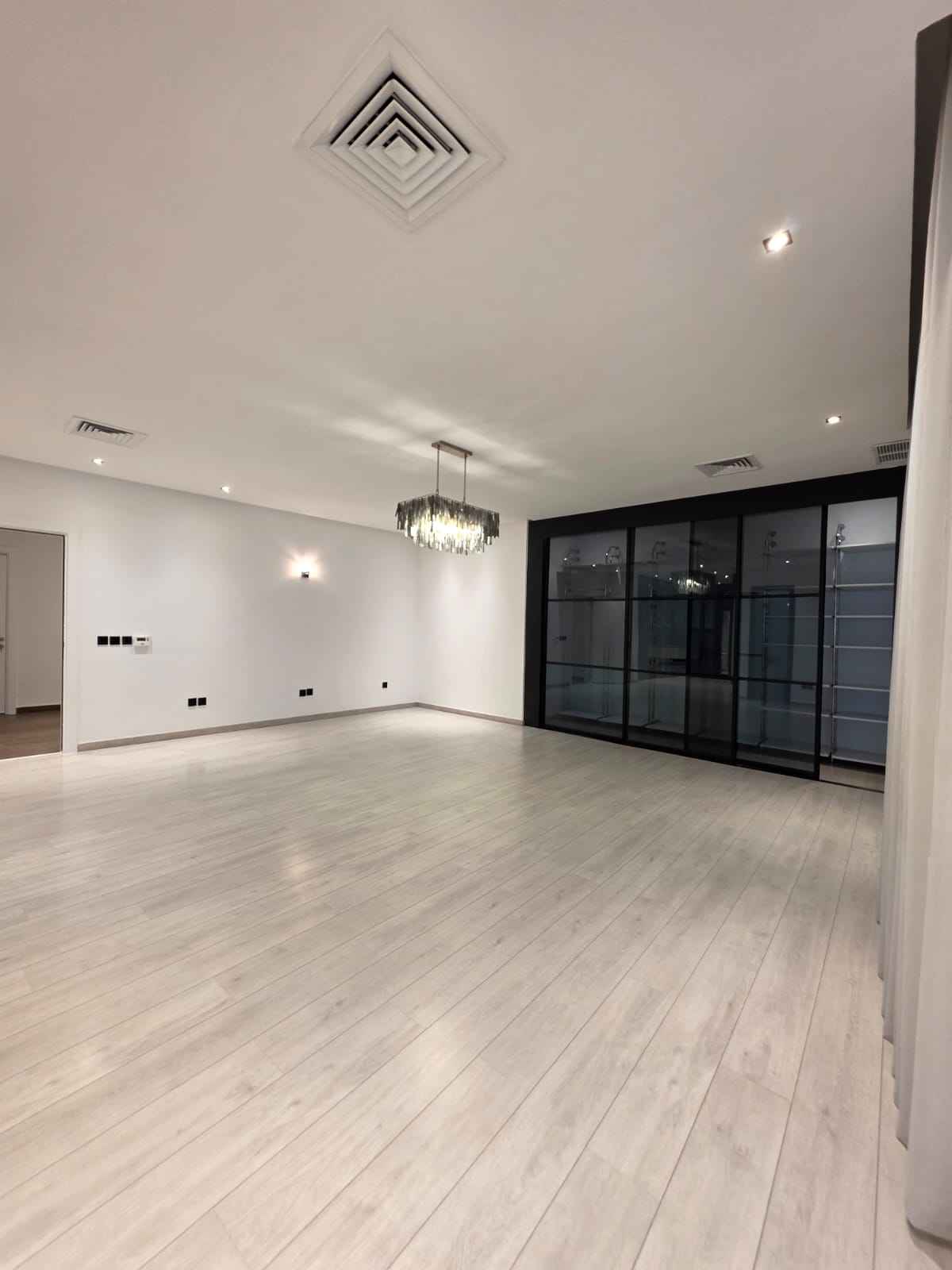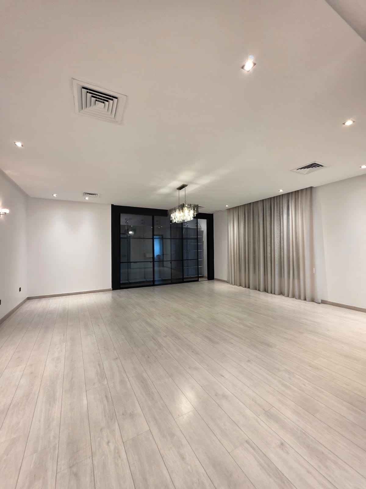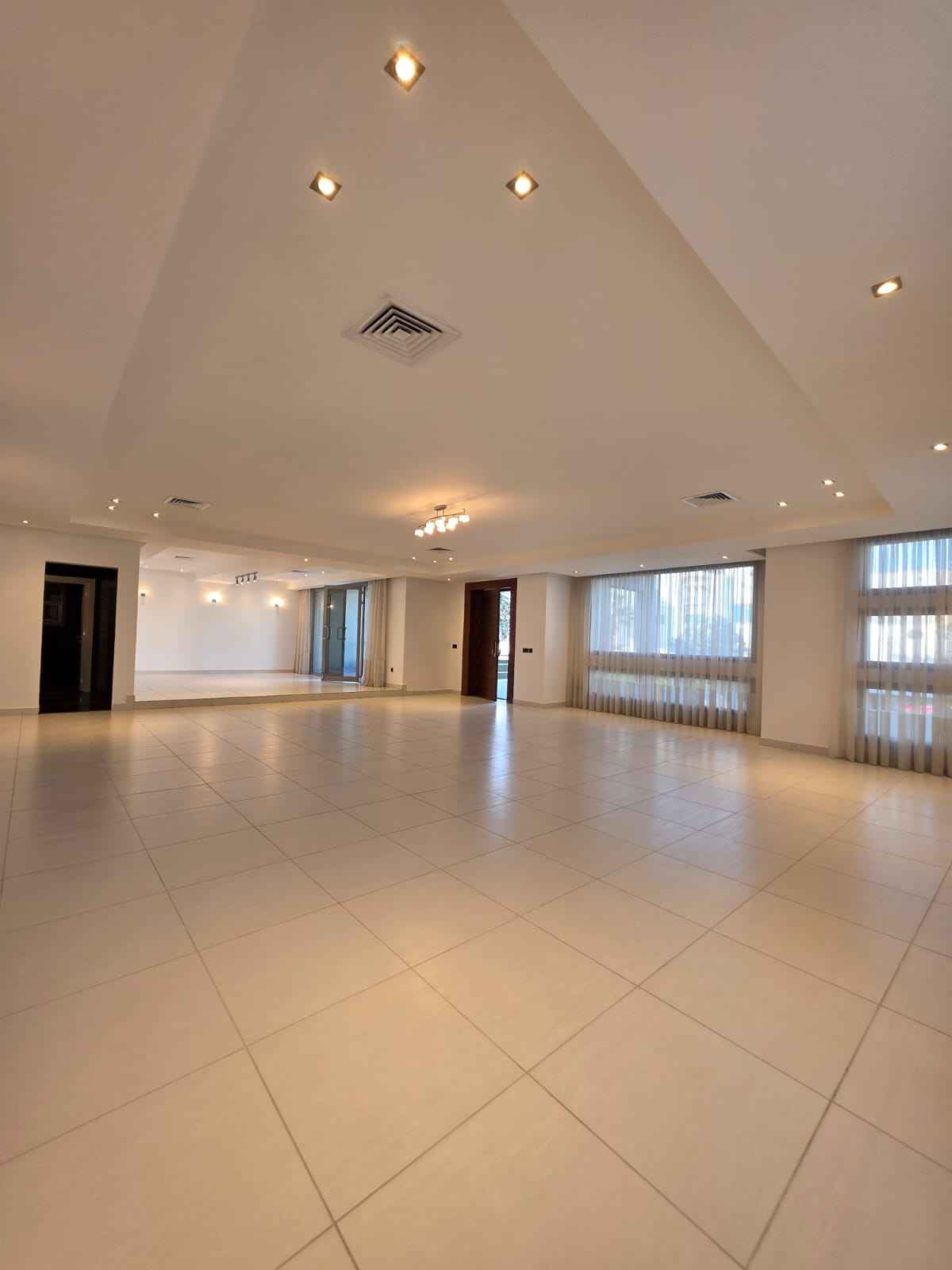 صالة معيشة عائلية: صالة كبيرة جداً بأرضيات سيراميك فاخرة وإضاءة سبوت لايت.