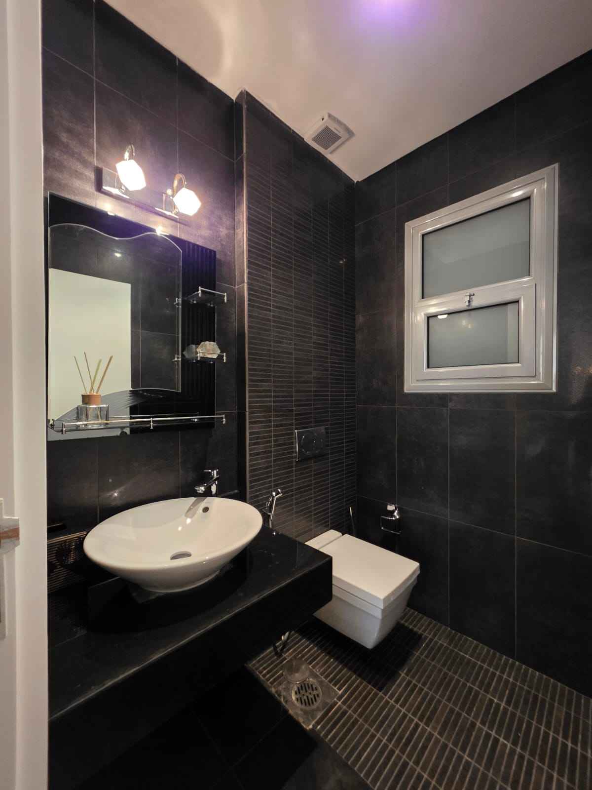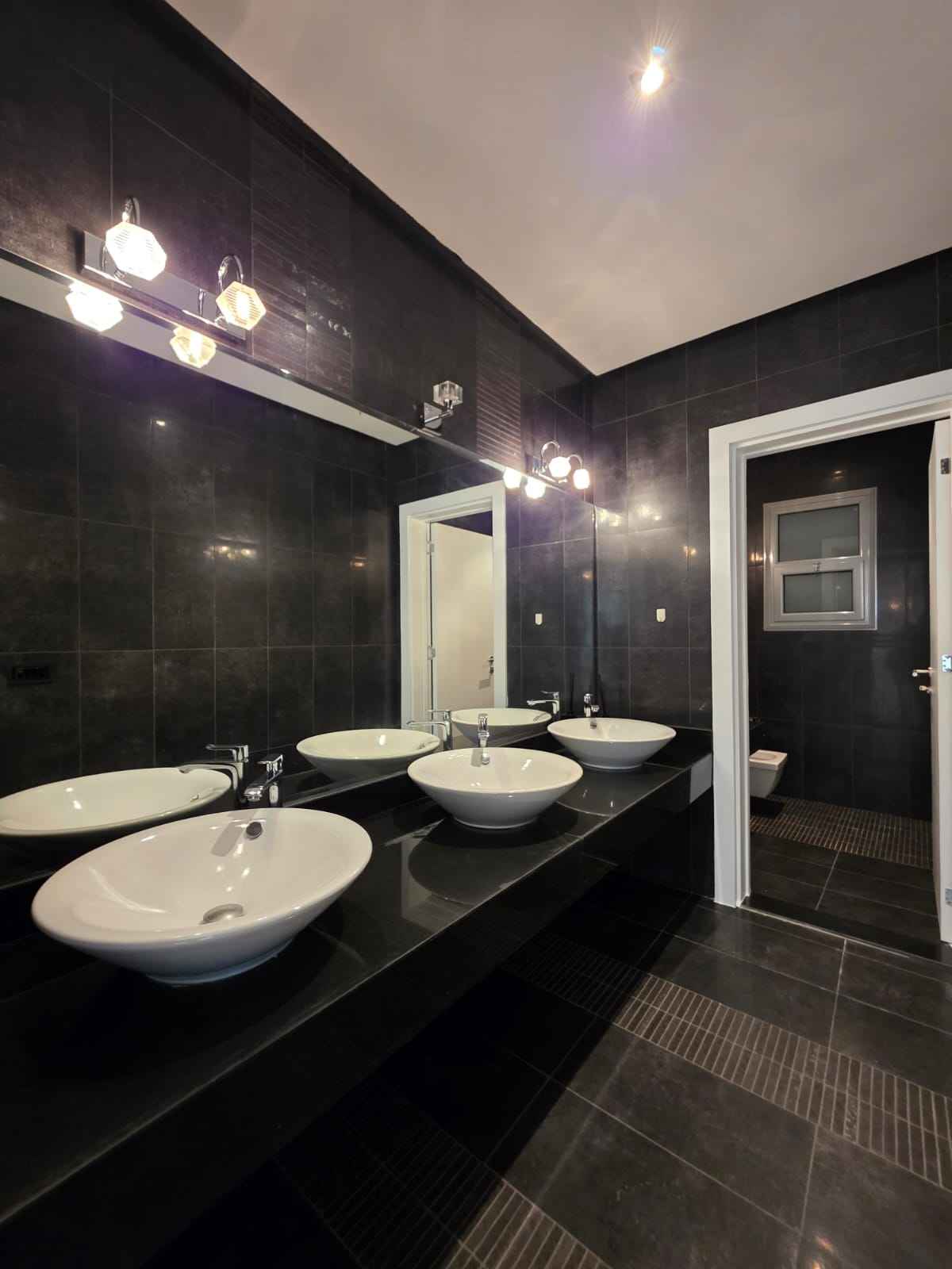 خدمات الضيوف: مغاسل وحمام ضيوف بتشطيب فندقي (رخام أسود فاخر).