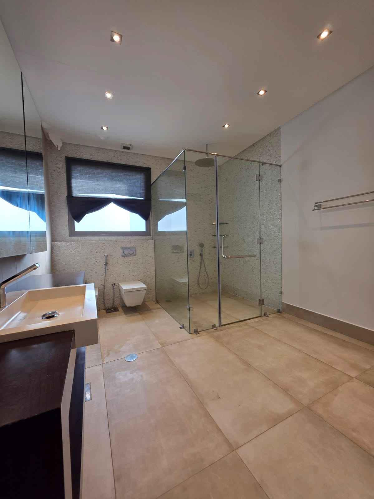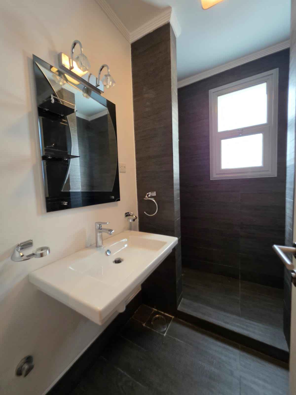 الحمامات: حمامات الغرف واسعة جداً، بتشطيبات "مودرن" (مغاسل معلقة، شاور بوكس زجاجي، بورسلان حجري).