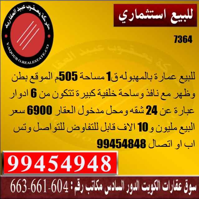 للبيع عمارة بالمهبولة ق2 زاوية شارعين مساحة 684م تتكون من 7 ادوار ومعلق 28 شقة وسرداب ومحل اسماك مؤجر الدخل الشهر 9500 سوم مليون و450 بيع مليون و500 الف