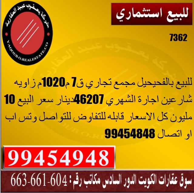 للبيع بالفحيحيل مجمع تجاري ق7 م1020م زاويه شارعين مكون من دور تجاري و9 ادوار ودور الخدمات اجارة الشهري 46207دينار سعر البيع 10 مليون