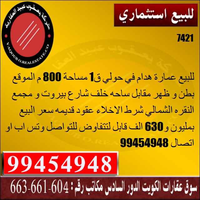 للبيع هدام في حولي ق1 مساحة 800 م الموقع بطن و ظهر مقابل ساحه خلف شارع بيروت و مجمع النقره الشمالي شرط الاخلاء عقود قديمه سعر البيع بمليون و630 الف