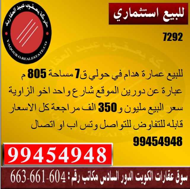 للبيع عمارة هدام في حولي ق7 مساحة 805 م عبارة عن دورين الموقع شارع واحد اخو الزاوية سعر البيع مليون و350 الف مراجعة