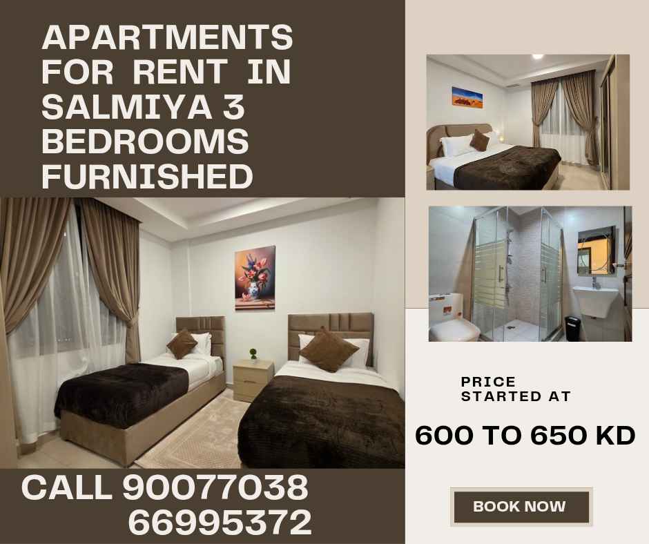 For rent in salmiya ,brand new 3 bedrooms fully furnished ,big living room ,one master bedrooms ,2 normal bedrooms ,bathroom ,kitchen fully equipmemt rent 600 to 650 kd + realestate fees half month call 90077038
