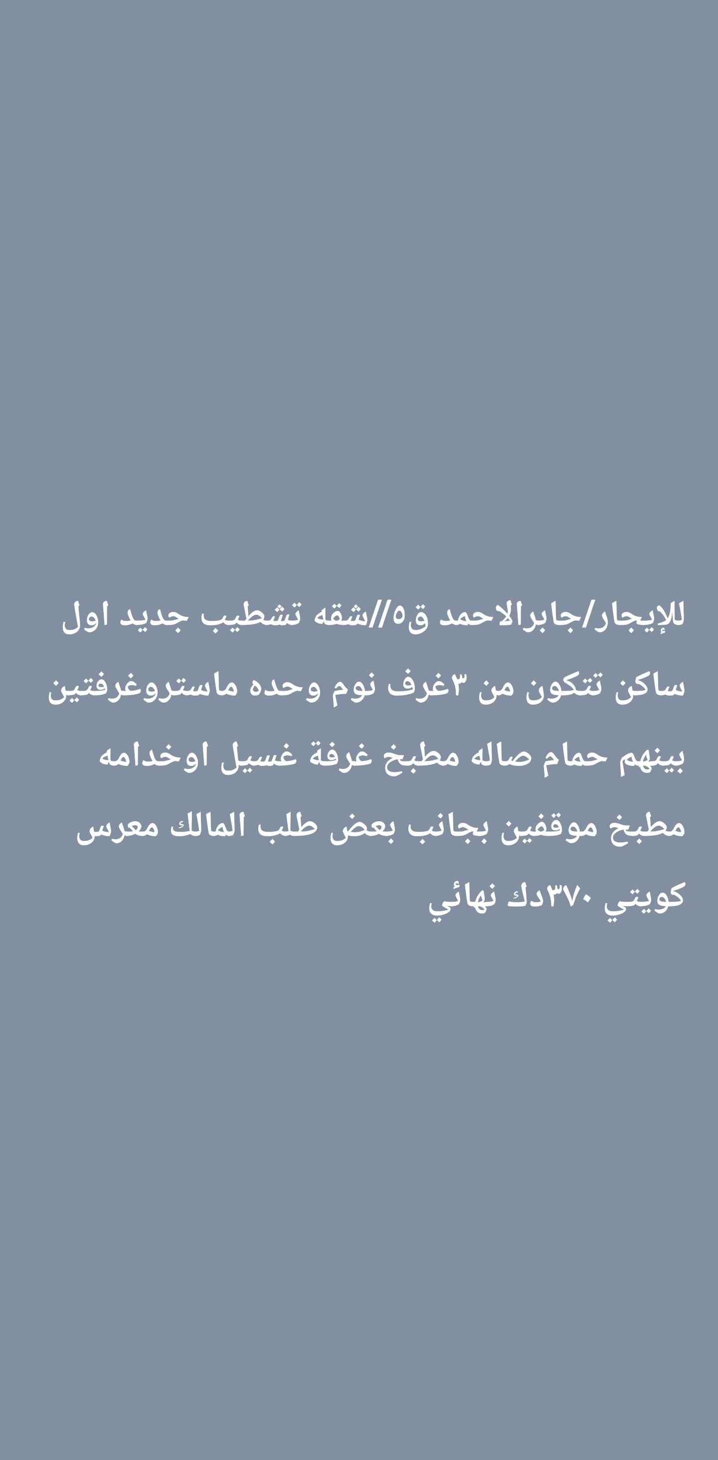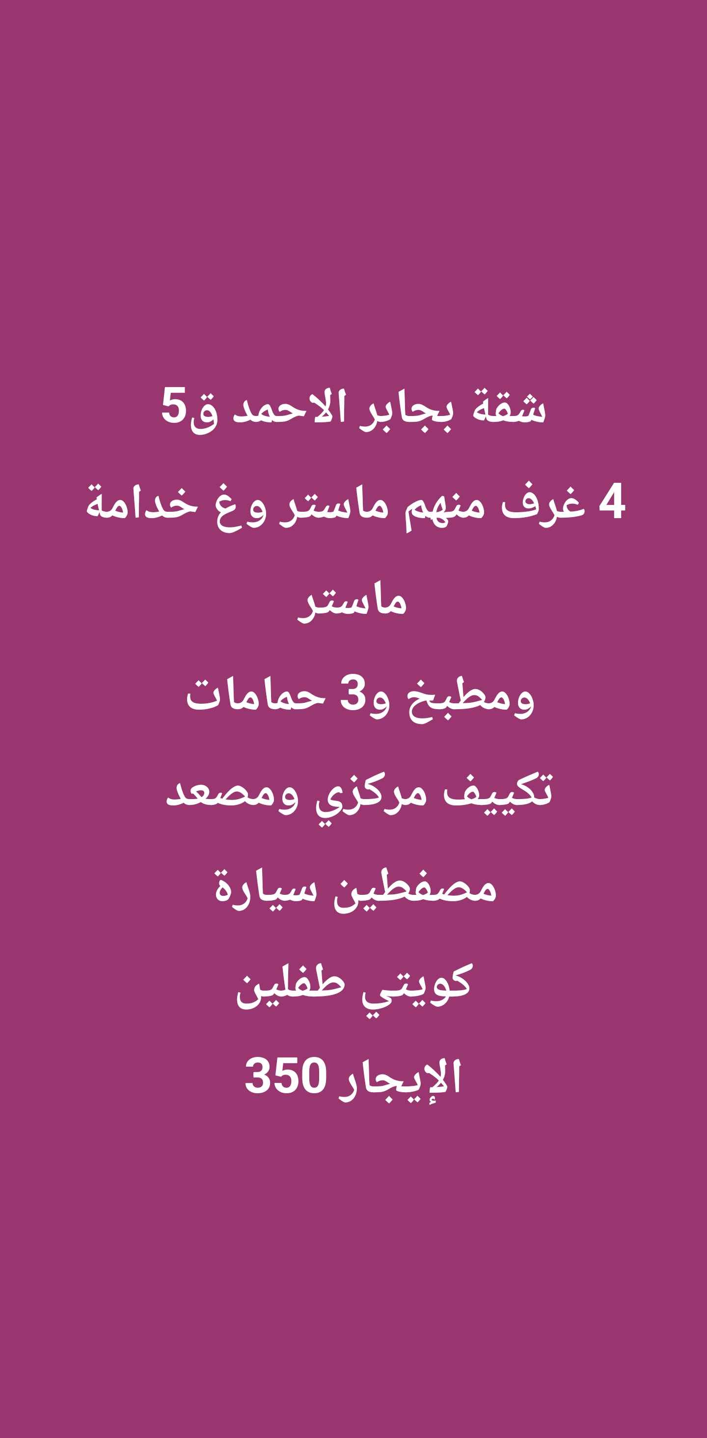 شمال غرب صليبيخات صالة وثلاث غرف وحده ماستر واثنين بينهم حمام يخدمهم وغرفة خ بحمامها البيت زاوية وموقفين للشقة تحت المظلة الدور الثاني يوجد مصعد الايجار ٤٠٠ دك اسرة صغيرة