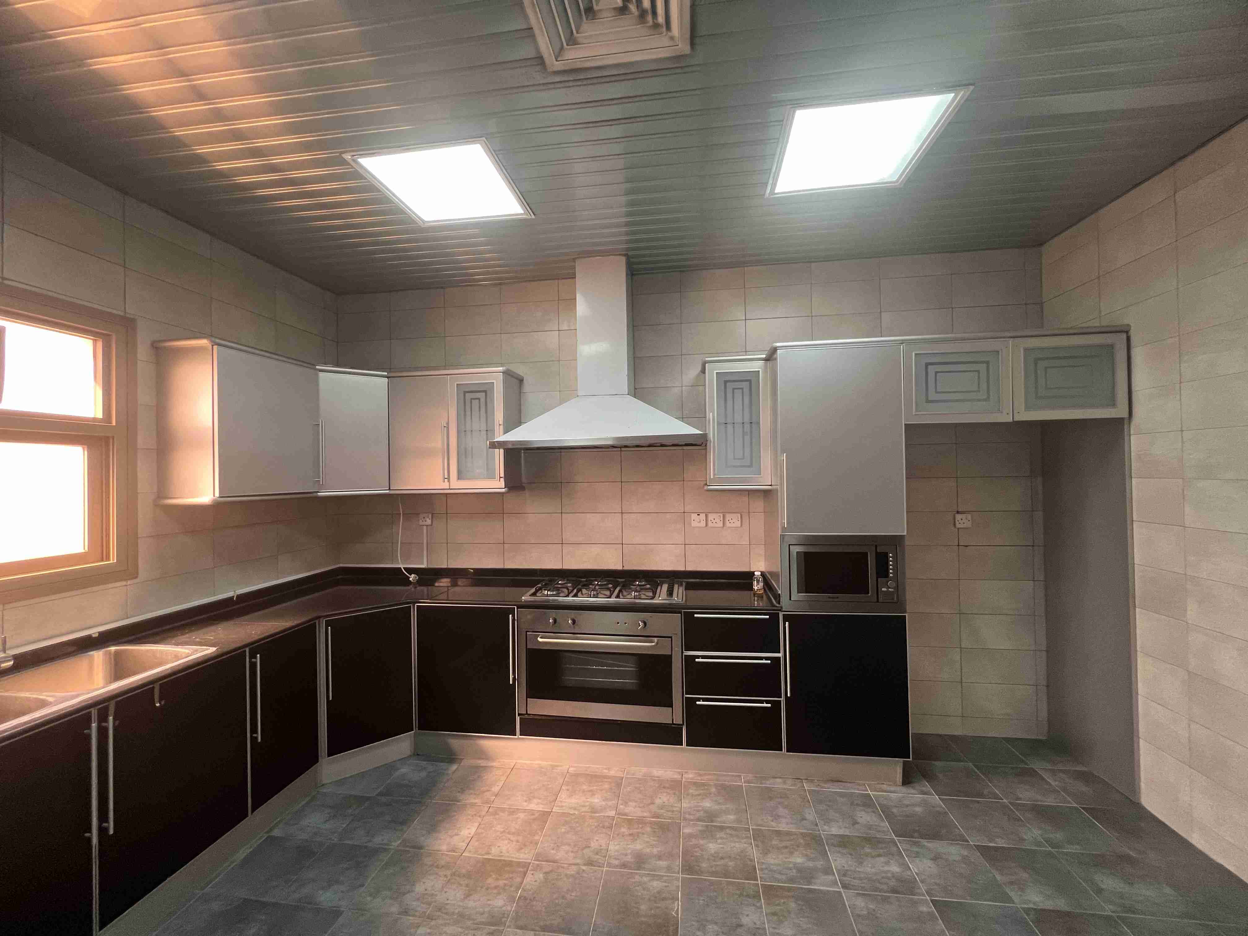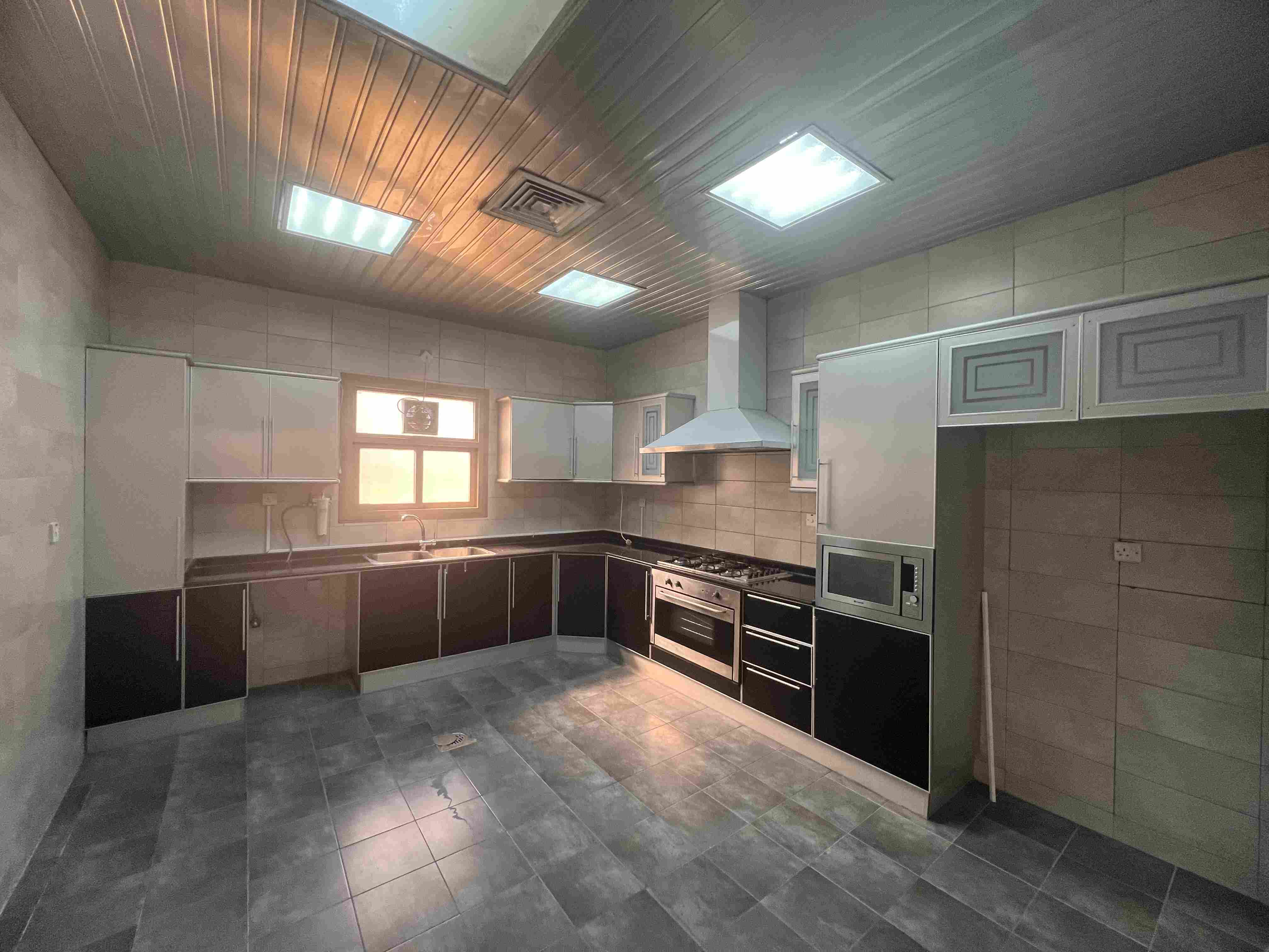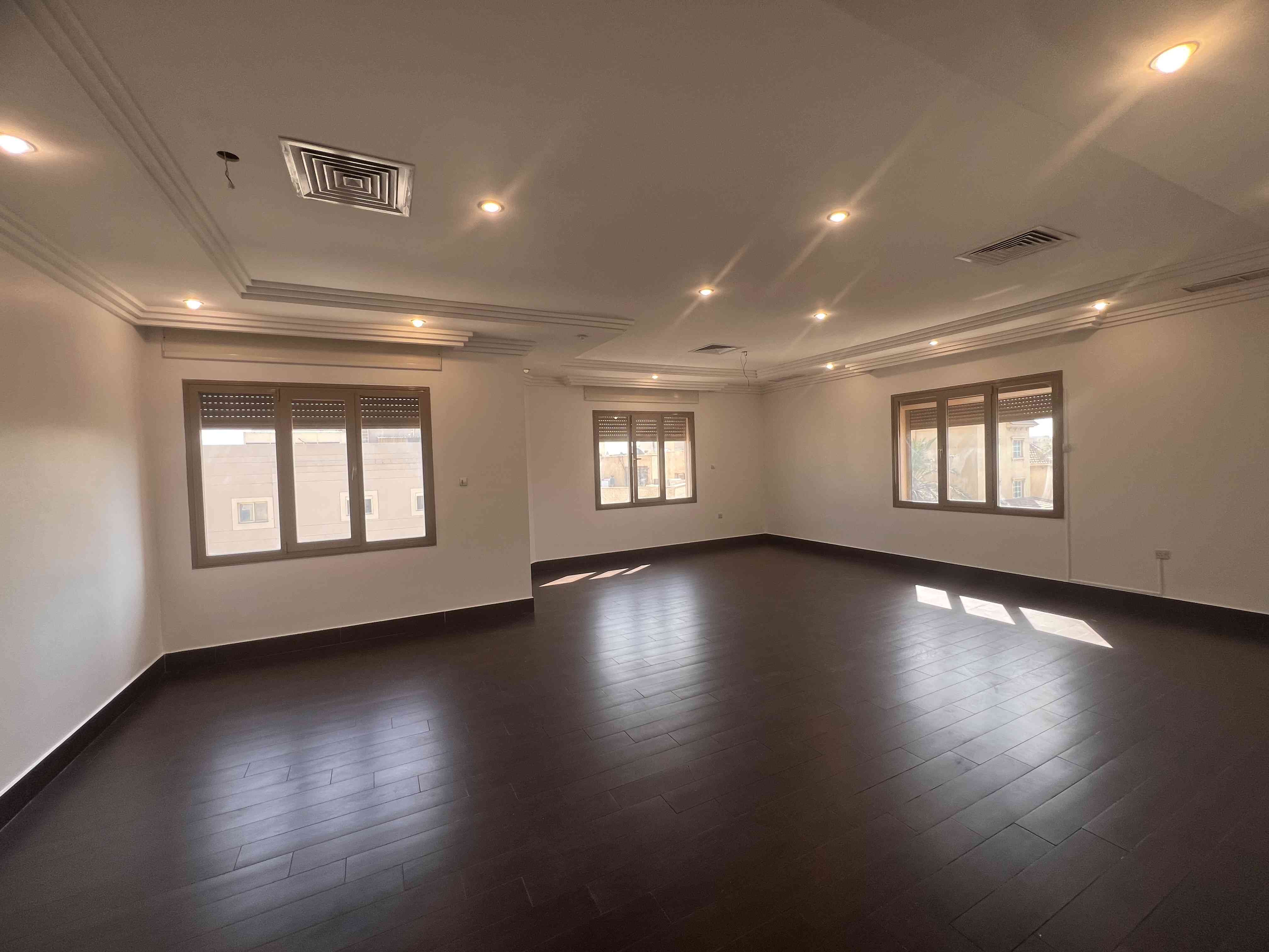 للايجار دور مشرف مساحات واسعه قرب الجمعية الرئيسيه 3 غرف نوم ( 1 ماستر) غرفتين بينهم حمام صاله كبيره مع حمام و مغاسل ضيوف صالون صغير مطبخ مجهز غرفة خادما مع حمام غرفة غسيل غرفة اوتي مكينتين تكييف مركزي مصعد موقفين في السرداب الايجار 760